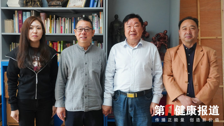 图为中医药融合促进分会会长周白宇(右二)、副秘书长王颖(左一)、副秘书长王宝林(右一)与第一健康报道总编辑李达(左二)合影